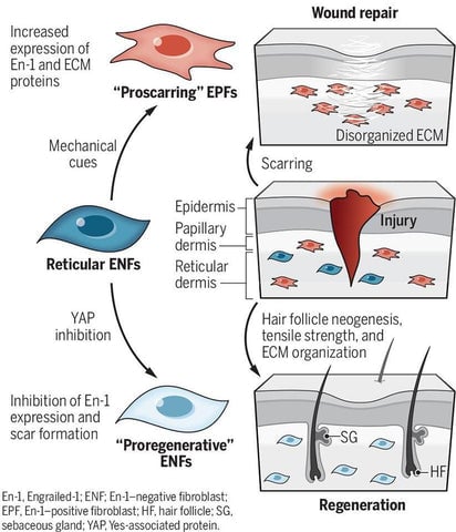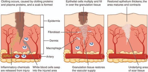 Scars form as part of the healing process after your skin has been cut or damaged. The skin repairs itself by growing new tissue to pull together the wound and fill in any gaps caused by the injury. Scar tissue is made primarily of a protein called collagen. Scars develop in all shapes and sizes.Scars form when the dermis (deep, thick layer of skin) is damaged.