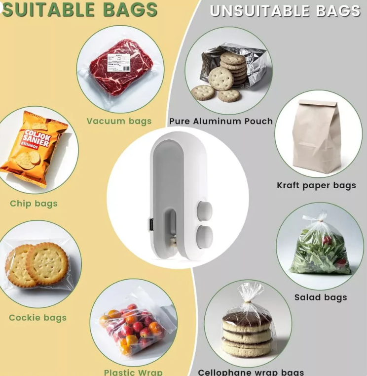 This product is specifically designed for sealing snack bags and is not suitable for cling film, fiberglass bags, kraft paper bags, or pure aluminum bags. Embrace the efficiency and convenience of our Mini Bag Heat Sealer and make it an essential part of your kitchen toolkit.